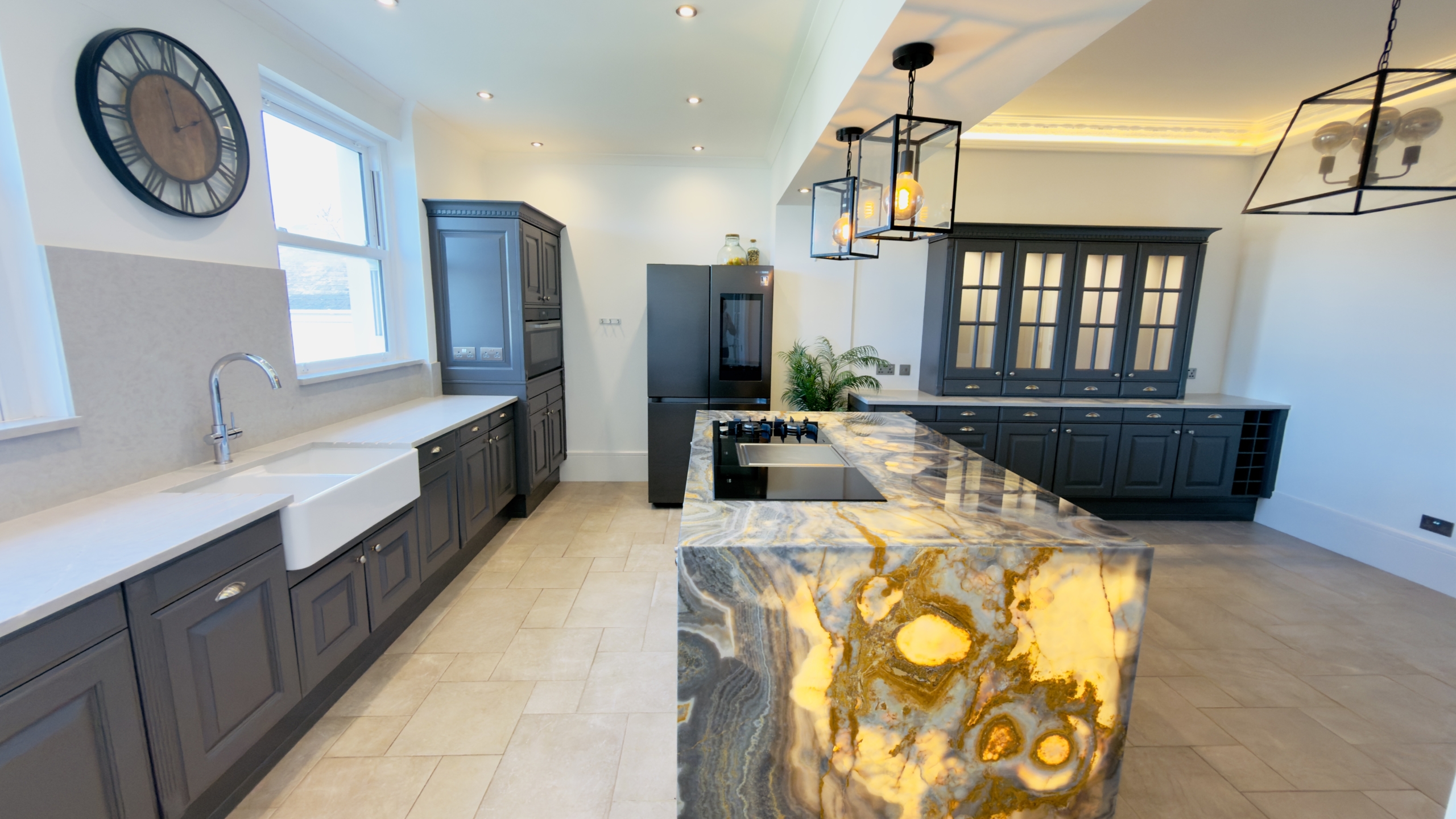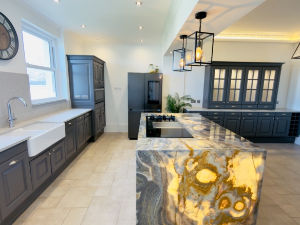 A wide and welcoming entrance hall defined by classical Romanesque curved archways and period detailing sets a graceful tone for the stylish interior beyond. To the front of the property are two generous reception rooms; the family room offers 55m of space with a discreet bar and both rooms open via French doors onto sunny eastern facing balconies. To the rear, the bespoke Pastella kitchen is the heart of the home, thoughtfully designed with abundant storage, underfloor heating and high-end Miele appliances. Of particular note within this apartment – the central island has been carved from book-matched Brazilian Onyx and is subtly illuminated from beneath, transforming the natural stone into a softly glowing focal point, plus it is one of only two of its kind in Jersey.